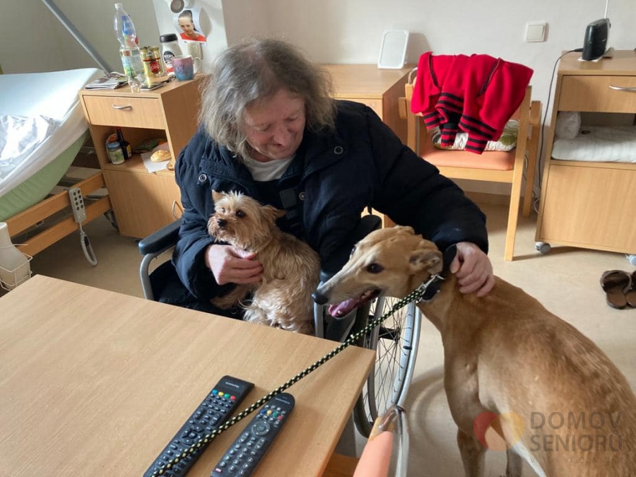Dvakrát do měsíce si naši klienti užívají návštěvu canisterapeutických pejsků. Nově k nám také chodí chrtík.
